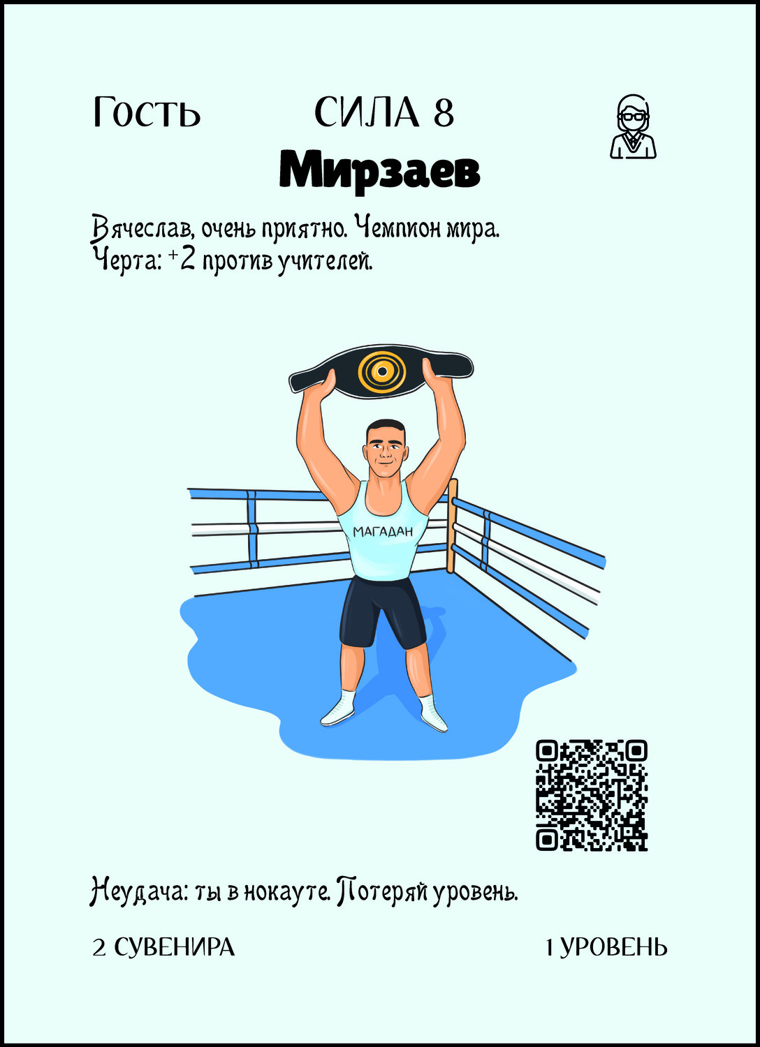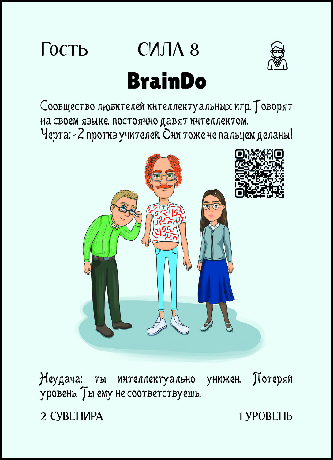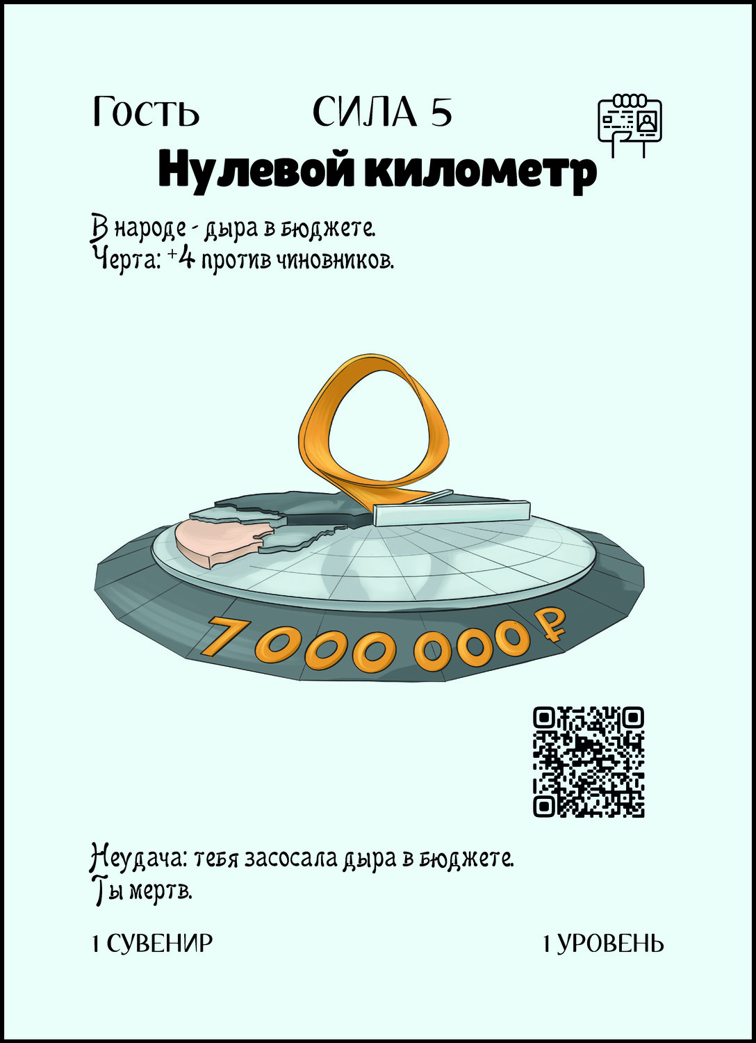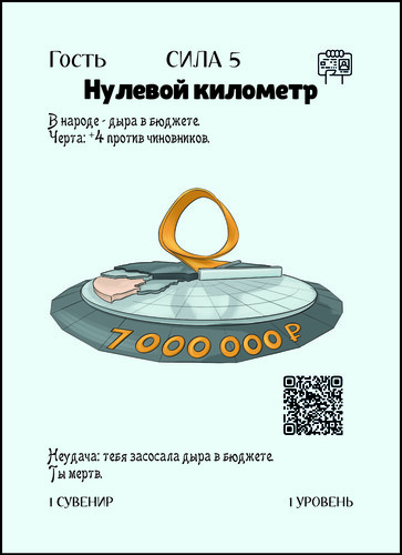 Если у тебя класс Чиновник, то его сила +9, если нет - то +5. Неудача: Ты мертв, а это значит, что все твои карты отправляются в сброс, а на следующем ходу выдаются новые. Уровни остаются. |