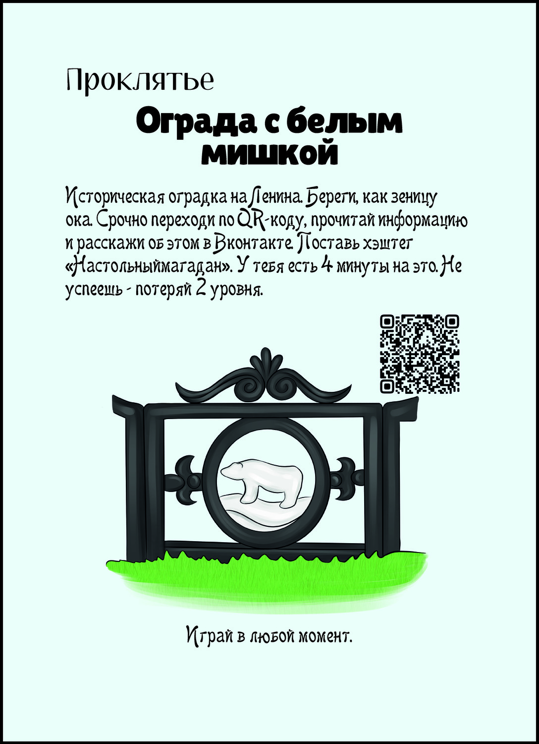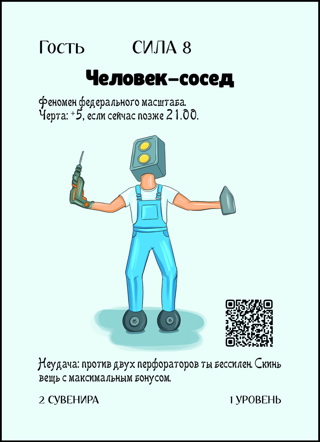 Если вы играете, а на часах позже 9 вечера, сила Соседа растет на 5. Неудача: придется избавиться от самой сильной надетой Вещи. |