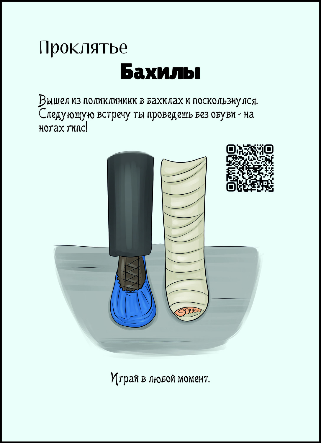 Проклятие срабатывает, когда выкладывается на стол. Если ты вытянул его из колоды в открытую - то на тебя. Если получил в руку - припрячь и в любой удобный момент сыграй на соперника. Избавиться от проклятия может только Врач или смерть персонажа. |