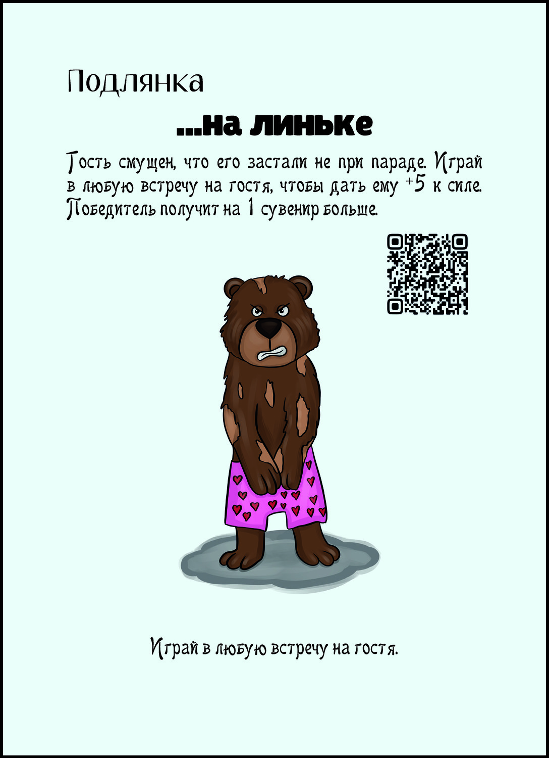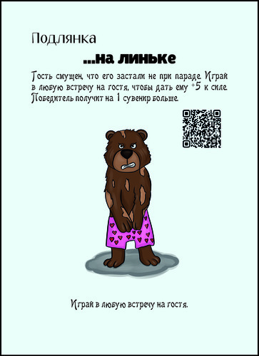 Эта карта может усилить Гостя на Встрече, прибавив к силе 5, но при удачной Встрече, игрок получит на 1 сувенир больше. Играй, чтобы подставить соперника, или чтобы усилить свою Встречу со слабым Гостем и получить больше сувениров. |