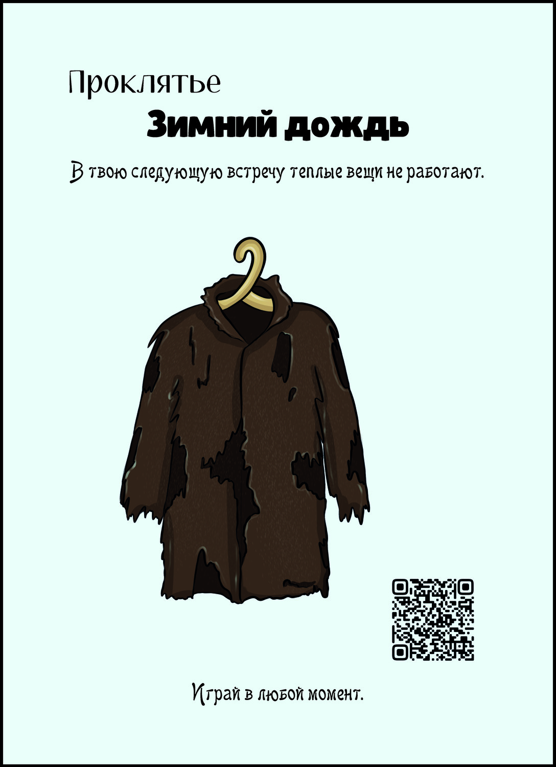 Проклятие срабатывает, когда выкладывается на стол. Если ты вытянул его из колоды в открытую - то на тебя. Если получил в руку - припрячь и в любой удобный момент сыграй на соперника. Оставь Вещи на месте, но поверни их на 90 на следующую Встречу. Бонусы этих Вещей не учитывай. |
