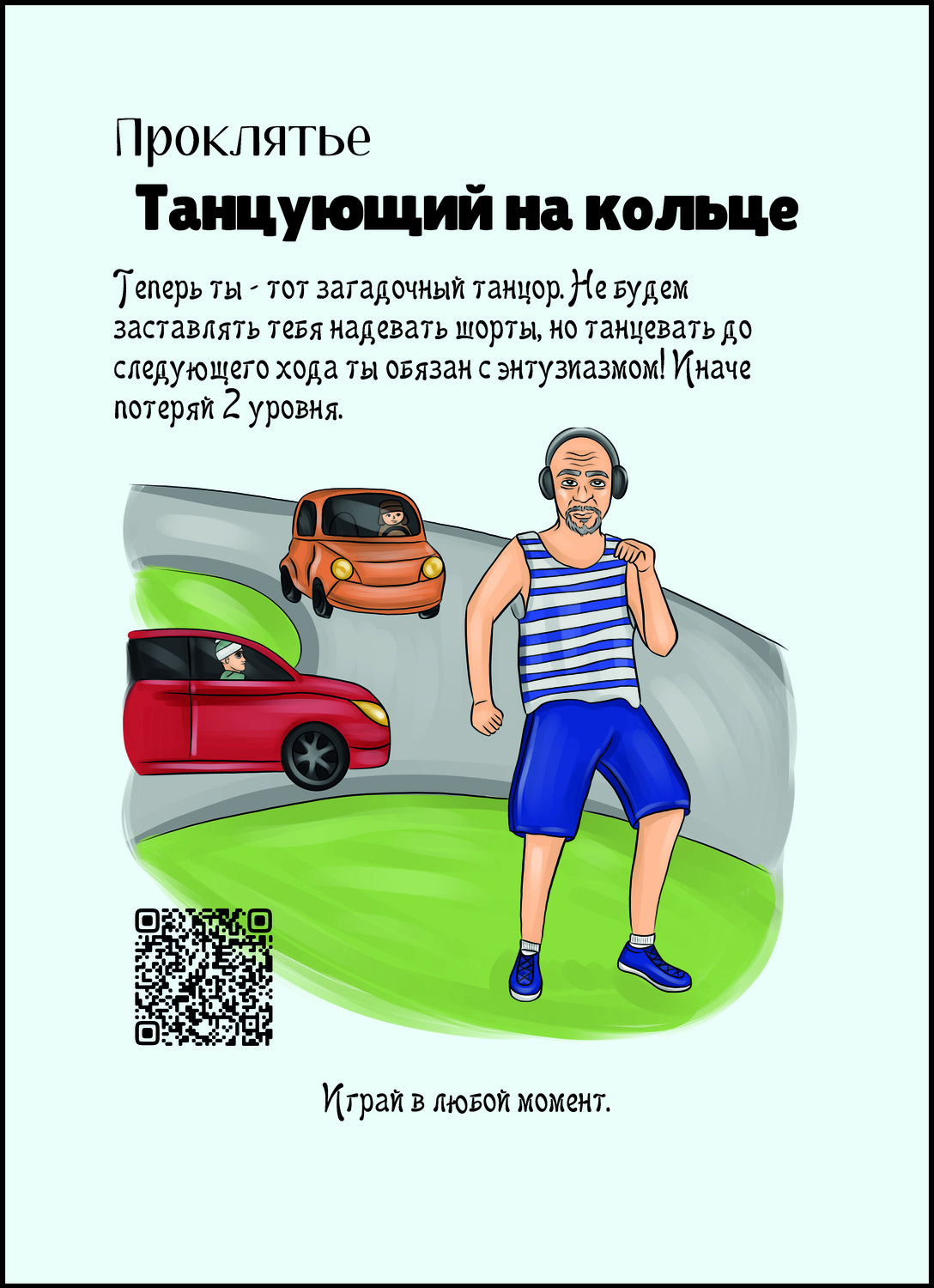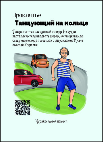 Проклятие срабатывает, когда выкладывается на стол. Если ты вытянул его из колоды в открытую - то на тебя. Если получил в руку - припрячь и в любой удобный момент сыграй на соперника. Тебе придется по-настоящему танцевать до твоего следующего хода. Не хочешь, стесняешься, не умеешь? Теряй 2 уровня! Если не можешь - персонаж умирает. |