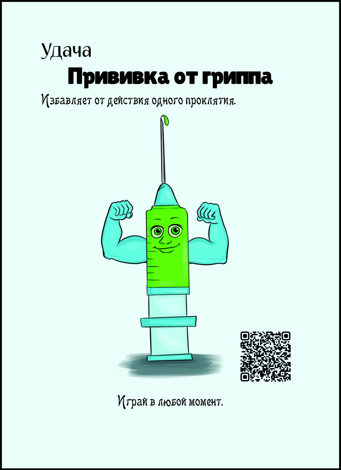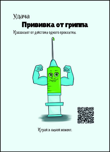 Если на тебя накладывается Проклятие, ты можешь избежать его эффекта, выложив на стол Прививку. И она, и Проклятье уходят в сброс. |