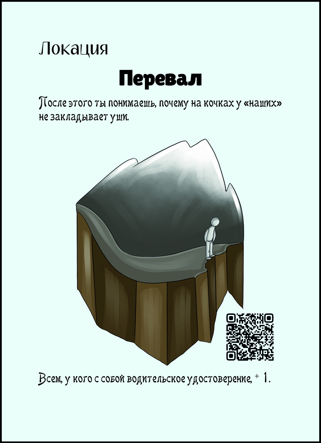 Все Встречи будут проходить на перевале. Если у тебя есть с собой водительское удостоверение, выложи его на стол - оно дает тебе +1. Фото не в счёт. |