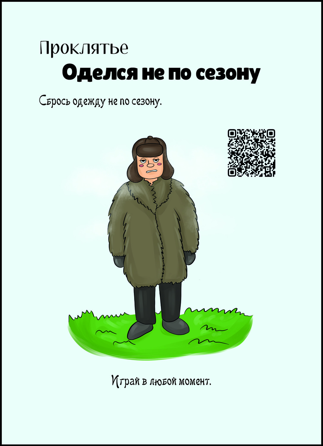 Проклятие срабатывает, когда выкладывается на стол. Если ты вытянул его из колоды в открытую - то на тебя. Если получил в руку - припрячь и в любой удобный момент сыграй на соперника. Договаривайтесь сами, по сезону ли, например, джинсы зимой. Но мы считаем, что не особо. |